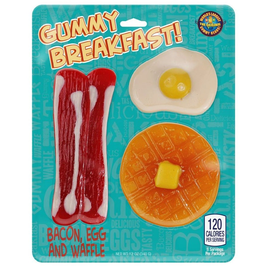 Breakfast served all day! Fuel your sugar rush with the Giant Gummy Breakfast! This breakfast inspired meal is made with some of our most unique gummy flavors to date! Enjoy two strips of bacon flavored gummy, the great maple taste of our gummy waffle and a berry blast flavored gummy egg. Sunny side up of course!